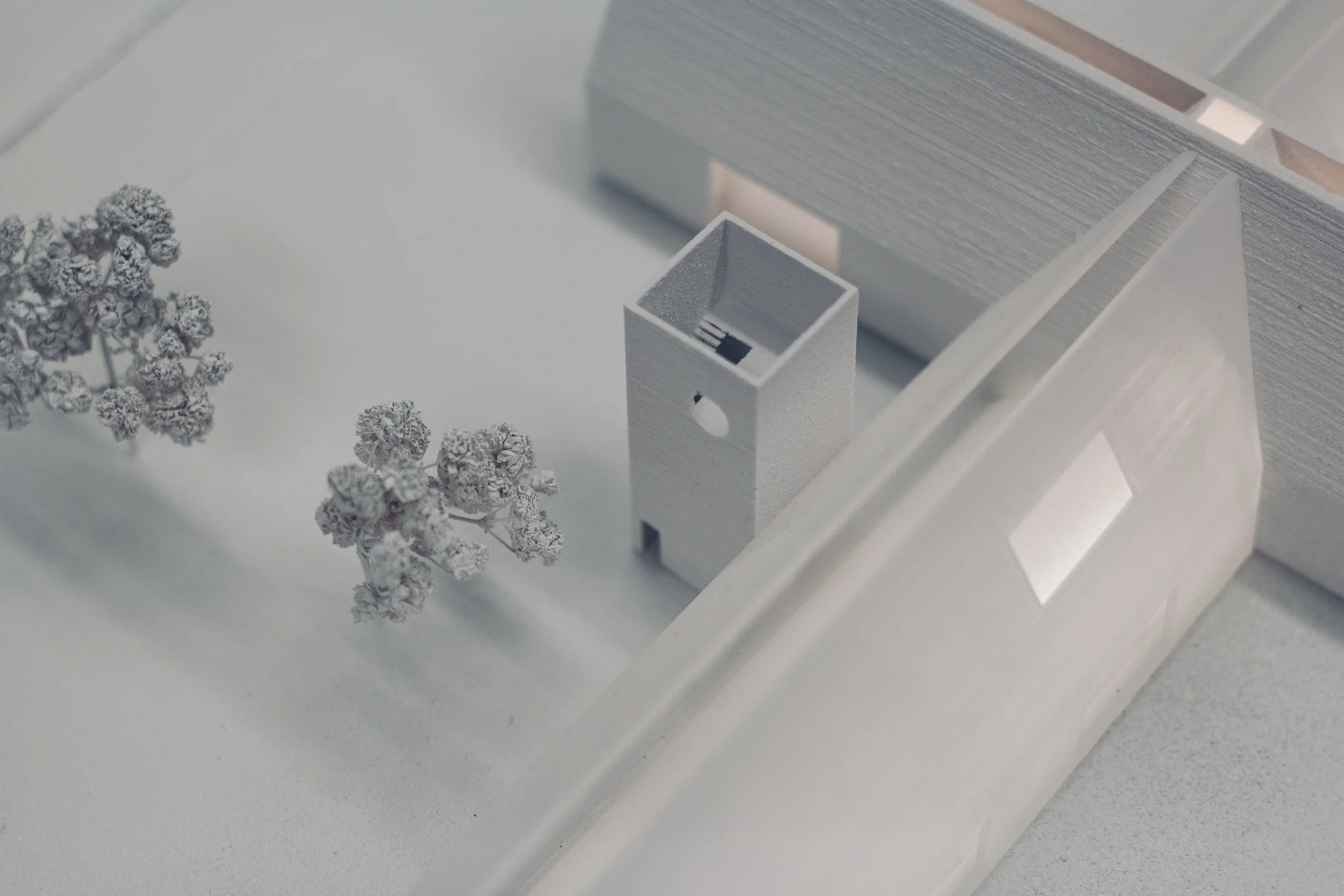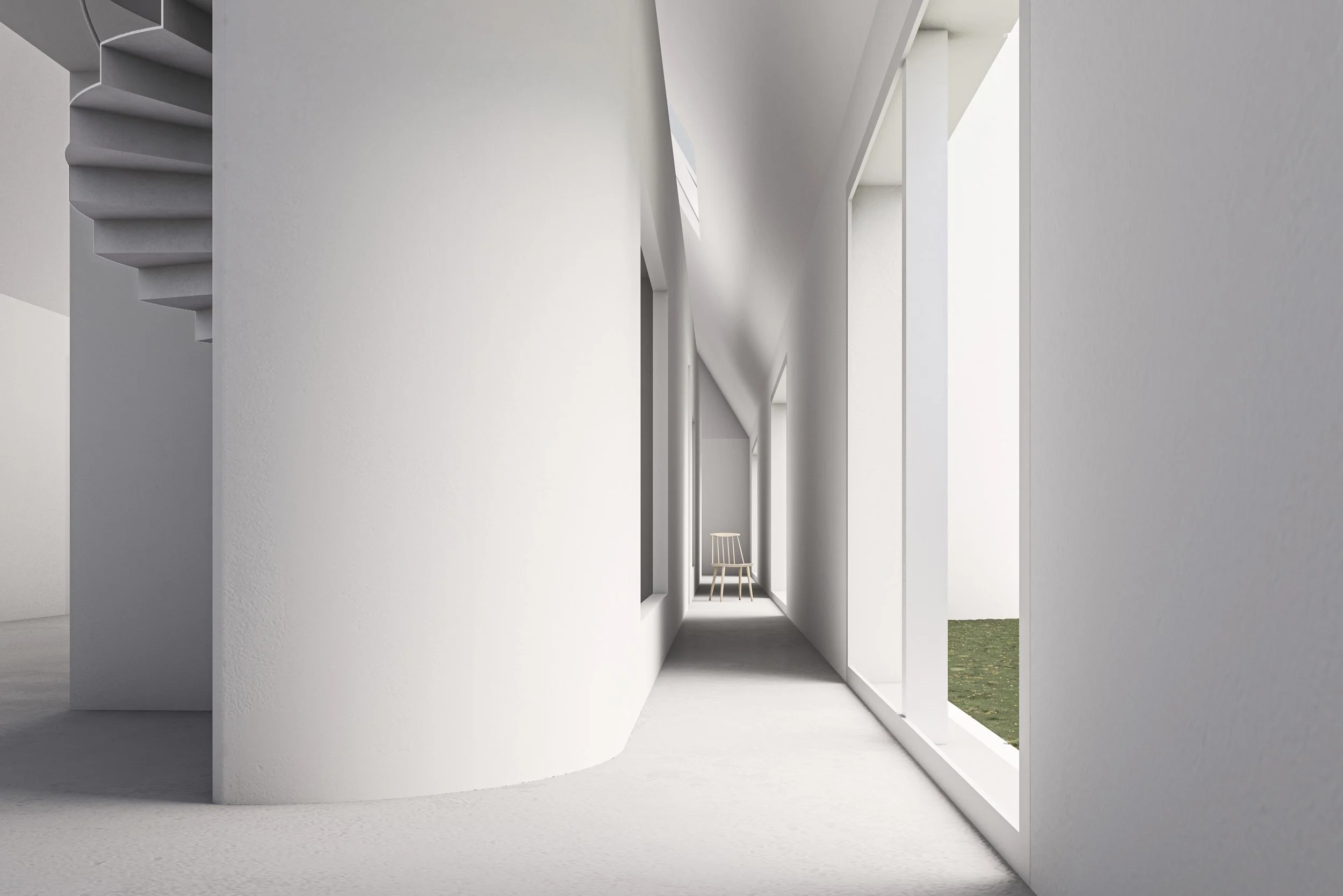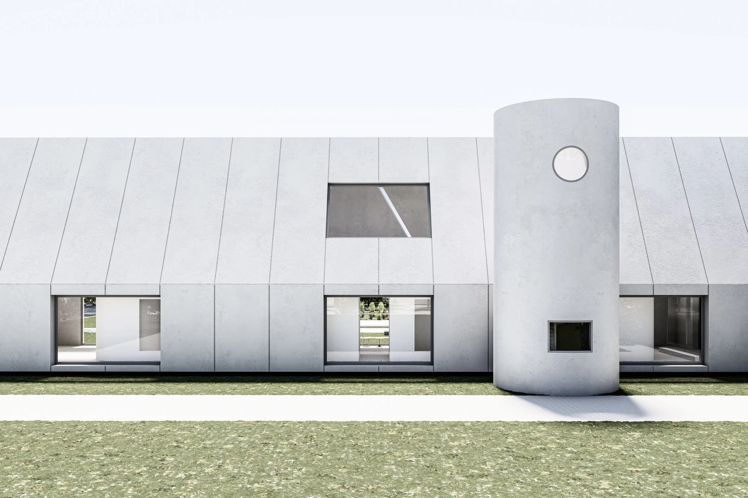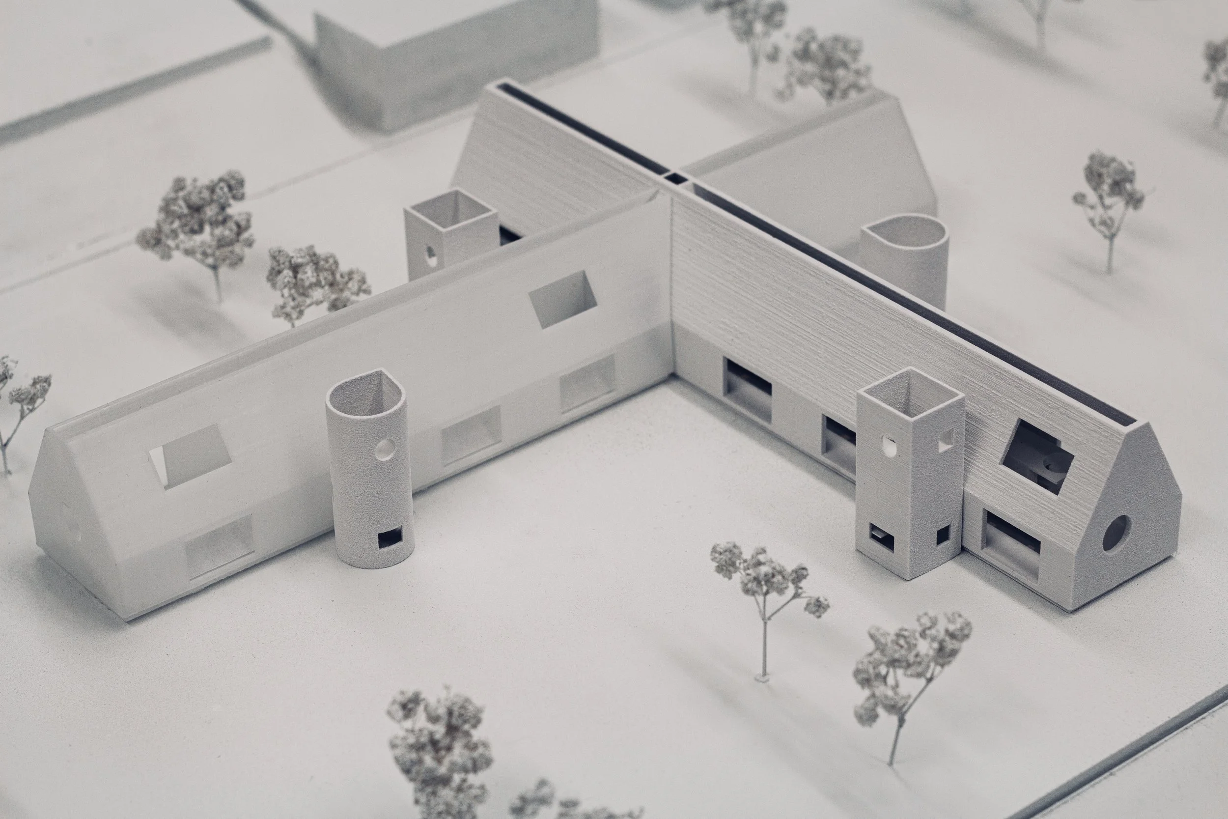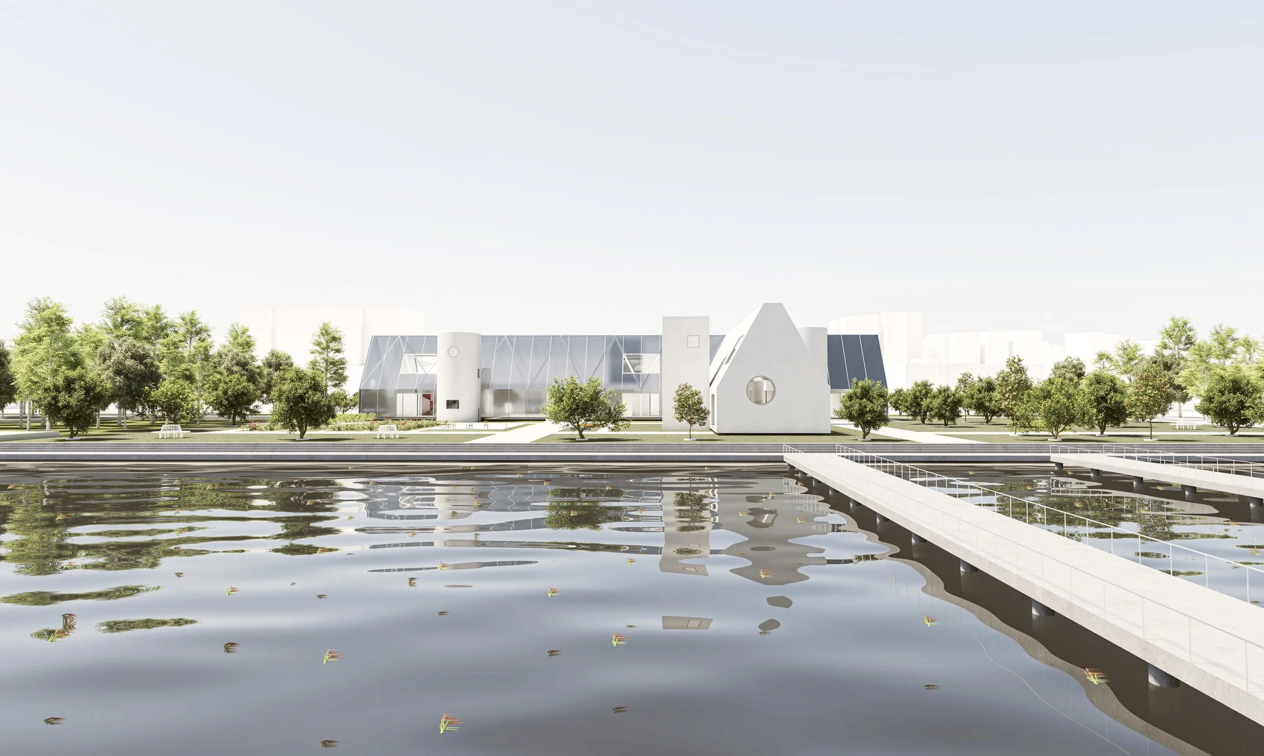 One barn is more solid and monolithic, while the other is more translucent and industrial, exposing its structural elements. In the larger barn on the left side, the greenhouse, storage, office, and meeting rooms are located, while on the opposite side, the food preservation room, packaging area, and restaurant kitchen are situated. Four vessels kissing the edges of the barns, serving as auxiliary programs, including a watching tower. The design creates four distinct courtyards, each holding a unique relationship with the community and the environment. The intersection of these two barns creates an opportunity to have a main space and organize programs around it. This main space follows the ideas explored by Japanese architects like Kazuo Shinohara in the 70s—the idea that a house can be built around a main space that is not about program or particular function, but only about the space. This project is designed using primitive shapes, forms, and figures that can be found in the surrounding neighborhood, and it vaguely sits between the barn and silo typologies.